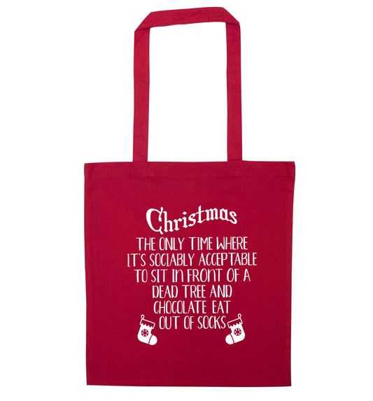 Christmas sit in front of a dead tree and eat chocolate out of socks | Tote Bag