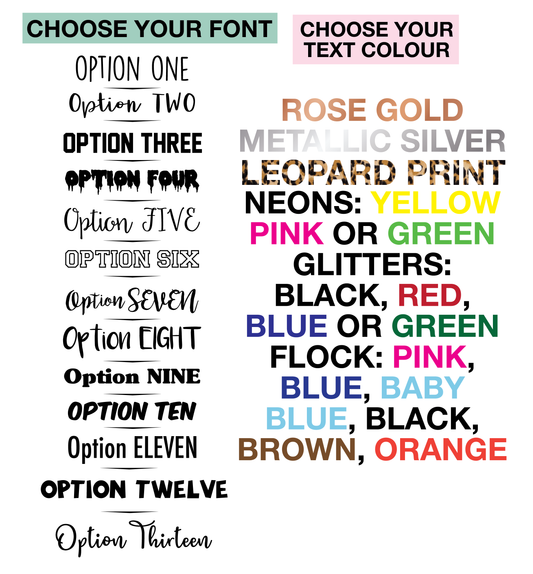 For our clothing if you would like to upgrade for an extra £1 to our premium custom items which include glitter, neon, flock, rose gold, metallic silver, matt silver and leopard print vinyl head over to this page here!